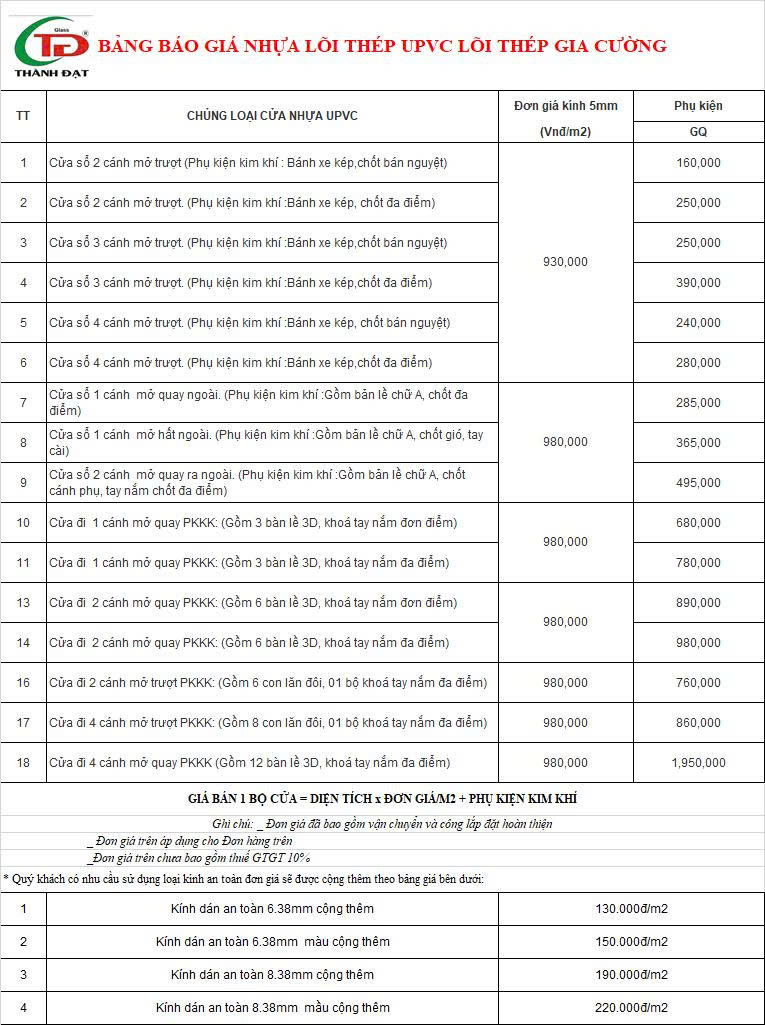 6. BẢNG BÁO GIÁ CỬA NHỰA MỚI NHẤT THÁNG 3 NĂM 2026 TẠI CÔNG TY THÀNH ĐẠT